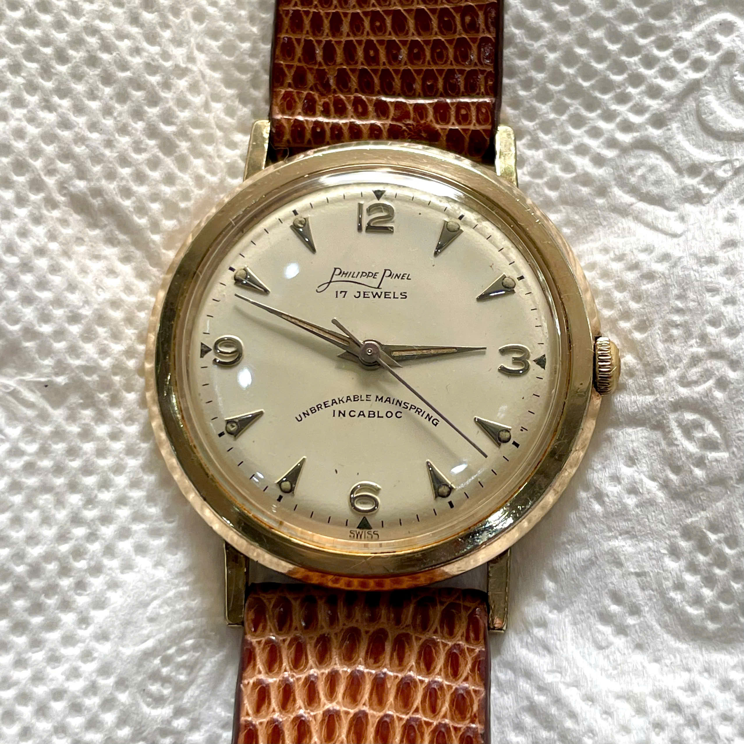 Đồng hồ cổ Philippe Pinel lên dây bọc vàng 10k chính hãng Thụy Sĩ với Mặt số zin 3 kim kết hợp với cọc số số học trò + răng cá mập full cổ điển rất đẹp.